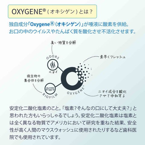 水、安息香酸Na、クエン酸Na、安定化二酸化塩素(オキシゲン)、酢酸亜鉛、水酸化Na、(クロロフィリン/銅)複合体、クエン酸