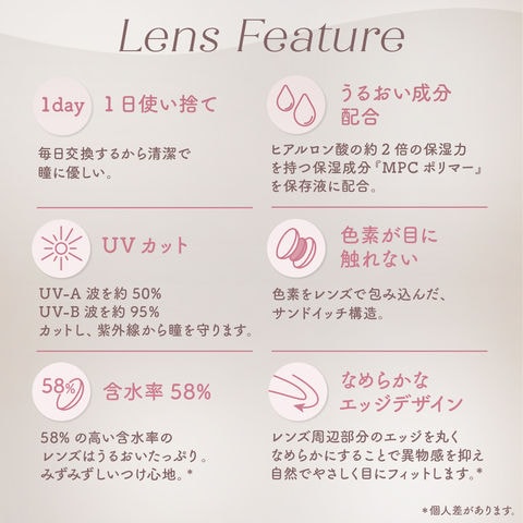 | 商品説明 | LaFORTE Lena 1day UV(ラフォルテ レナ ワンデーUV)。No.111-No.113は自然な色味で毎日でも使いやすいナチュラルライン。No.101-No.104はフチなしのほんのり色づく瞳になじむデザイン。色素をレンズで包み込んだサンドイッチ構造。保湿成分「MPCポリマー」配合。 |
