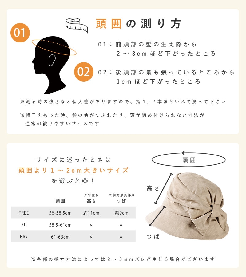 | ※高さは実際に被る部分の高さです。商品全体の高さとは異なります。 (平置き)との記載がある場合、素材が柔らかい、伸縮性等の理由から、平置きでの計測サイズを記載致しておりますので、ご確認下さいませ。 ・画面上と実物では多少色が異なって見える場合がございます。 ・お取り扱いの前に品質ネームタグの記載をご確認下さいませ。 ・商品の品質ネームタグにカラー表記はございません。 ※モデル撮影は屋外の為、実際の商品と色合いが異なります。単品商品の撮影画像が実際の商品と色合いが近くなっておりますので、ご参照下さいませ。 ※内側後方部分にサイズ調整マジックテープ。 |