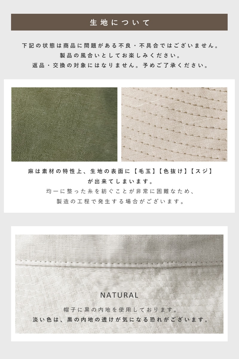 | ※高さの表記が同じ場合、デザインや形により被り心地、印象が異なります。着用時の高さを記載致しております。 (平置き)との記載がある場合、素材が柔らかい、伸縮性等の理由から、平置きでの計測サイズを記載致しておりますので、ご確認下さいませ。 ・画面上と実物では多少色が異なって見える場合がございます。 ・お取り扱いの前に品質ネームタグの記載をご確認下さいませ。 ・商品の品質ネームタグにカラー表記はございません。 ※モデル撮影は屋外の為、実際の商品と色合いが異なります。単品商品の撮影画像が実際の商品と色合いが近くなっておりますので、ご参照下さいませ。 ●麻混の特性にご注意下さい。 |