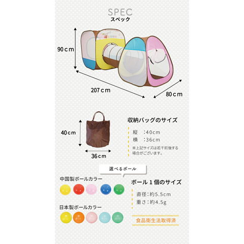 | セット内容 | ・テントx2 ・テントふたx2 ・テント収納袋x1 ・トンネルx1 ・収納バッグ(ネット)x1 |