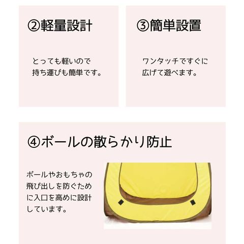 | 商品説明 | ・床面を除き全体が網になっていますので、どこからでもお子様の確認が出来ます。 ・設置及び収納は、とても簡単です。 ※ボールは付属しません。 |