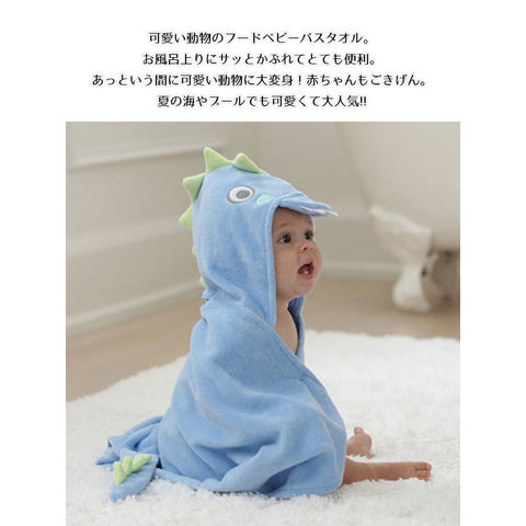 | 商品説明 | お風呂上がりやプール水浴びの時もパッとはおれる可愛いバスタオルです。ベビーサイズなので軽くて柔らかいです。頭にかぶると可愛い動物になっちゃいます。 ※前を止めるスナップボタンはついておりません。 |