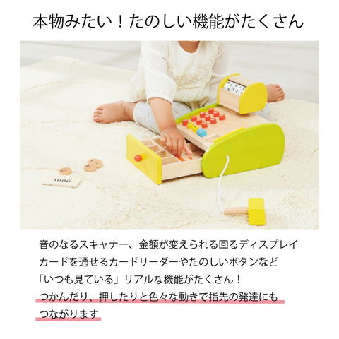 | 商品説明 | 音の鳴るスキャナー、金額が表示される回転式のディスプレイ、ポイントカードを読み込むカードリーダー、日本円で全種類を数枚ずつ揃えた木のお金など、リアルで機能的になりました。木目を生かした色合いで、インテリアにもぴったりです。 |