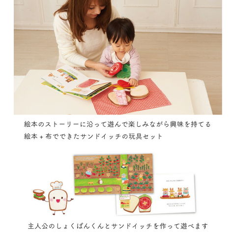 | 商品説明 | しょくぱんくんとサンドイッチ 食材をはさんでサンドイッチのできあがり!お子さまに大人気のままごと遊びを、ままごとに興味を持ちだす低年齢のお子様から遊べるように布のおもちゃで登場です。 絵本だけでも、おもちゃだけでも、いっしょに遊ぶことでもっと楽しい! 手洗いできるので清潔に遊べます。 絵本を読みながらお子さまに人気のサンドイッチを作って楽しめます。 畑や森・牧場など絵本の中でしょくぱんくんとお出かけしよう!お子さまが楽しみながら野菜や料理に興味を持っていただけるような絵本です。 |