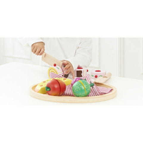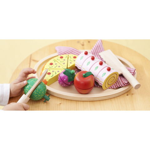| 商品説明 | 今日はパーティ。さくさく切ってきれいに並べましょう。パーティにかかせないピザ・ケーキの他、メロン・いちごなどの果物と、トレー・包丁・クロスを加えました。 サクッと切れる食べ物に子供たちは大喜び。ままごとあそびは想像力を高めます。 2種類のナイフがついているので、おともだちとみんなでワイワイあそべます。 切った食べものはトレーにのせて、できあがり。たのしいパーティがはじまるよ! |