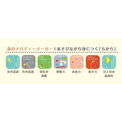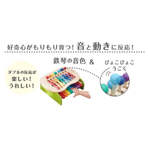 | 商品説明 | 動きと音を楽しむ!押すことが楽しくなる! 鍵盤を押すと、音と連動して丸いモチーフがぴょんぴょんと跳ねます。 音と動きが連動することで、相乗効果で大きな喜びを感じ、関係性に興味を持つきっかけになる商品です。 天板の上に鉄琴が出ているので、それをバチで叩いて遊ぶこともできます。 強弱などの指先の訓練、創造力、発想力、指の動きと位置を空間的に認識する力、メロディーを覚える力などを養う事ができます。 |
