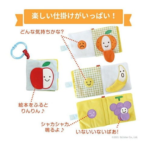商品説明フルーツをめくるとかわいい顔が出てくる、赤ちゃんの大好きなフルーツと表情を掛け合わせた布絵本。