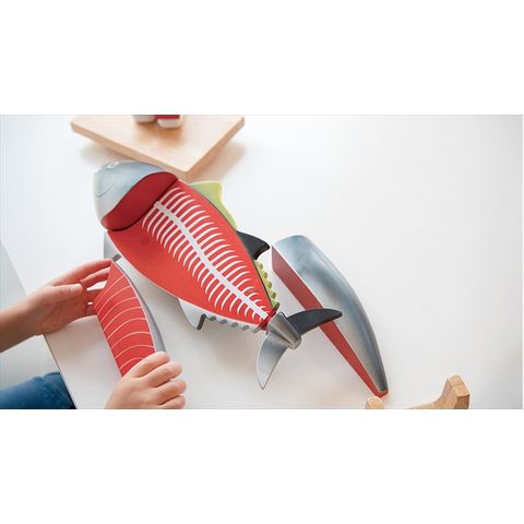 | 商品説明 | 「海の黒いダイヤ」と呼ばれるクロマグロの解体からお寿司づくりまで、本格的な体験ができるままごとセット。本物のマグロ解体のように5枚おろしが可能!頭、尻尾、中落ち、腹側2丁、背側2丁切ることができます。解体し終えた後は、お寿司を握って「へい、お待ち!」と寿司職人になりきり!ごっこあそびではコミュニケーション力が養われる他に、両手の協応動作(身体の異なる器官や部位を同時に、適切に動かすこと)ができます。「目」で見た情報を「頭」で理解して手や体を動かすので、物の数を正確に数えたり、文字が上手に書けるようになるなど、お子様の発育に役立ちます。遊ばない時はスタンドに乗せて標本のように飾って楽しめます。マグロと他の魚の違いを色や形で学んだり、魚の身からマグロの寿司ネタができることを理解できるので、命を頂いていること、食に対する感謝の気持ちなど食育を学べます。 |
