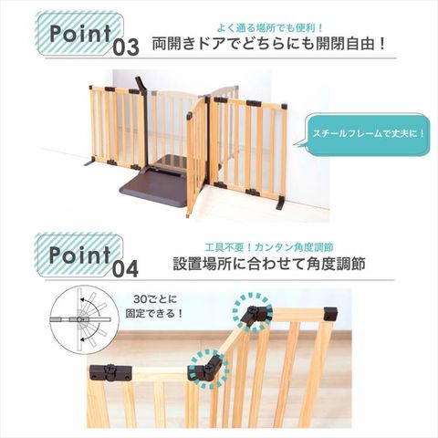| 商品説明 | 注:階段上では使用できません。取り付け対応幅:75~178まで 跨がず通れて簡単設置。ドア付き木製タイプが新登場。 安心・安全のダブルロック機能、扉は両開き式です。 |