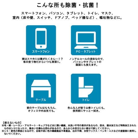 | 商品説明 | お出かけ先でのノンアルコール除菌液。ティッシュなどに液を出し。気になる所を拭くだけで除菌ができます。また菌を取り除くだけでなく、抗菌作用がなんと18時間も続きます。 |