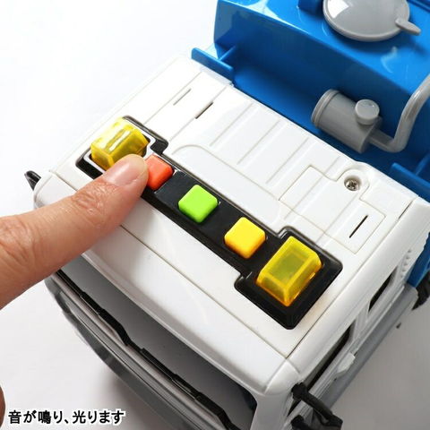 | 商品説明 | 小さなボタンを押すと音が鳴ったり光ったり!タンクには水を入れられボタンを押すと、なんとホースから水が飛び出します!ホースは上下左右に動き、車本体を動かすと下のブラシもくるくる回り、お掃除している様子が楽しめます 電池:釦電池(LR44)×3 |