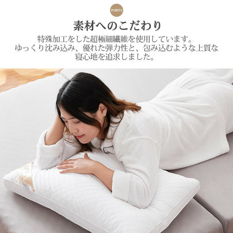 【おずりしたくなる肌触り】特殊加工をした超極細繊維を使用しています。ゆっくり沈み込み、優れた弾力性と、包み込むような上質な寝心地を追求。通常のまくらより通気性が優れ、湿気もたまらず、におい・カビなどが付きにい。