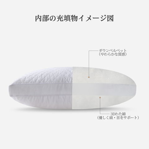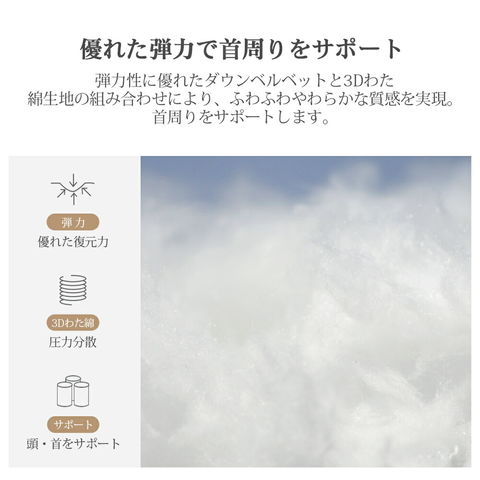 【ふかふかボリュームたっぷり】 中材にはダウンベルベットと3Dわたの組み合わせにより、ふわふわやわらかな質感。羽毛が入った枕のようにソフトな寝心地。柔らかいのに適度な弾力があるので、しっかりと頭を支え、寝姿勢をサポート。