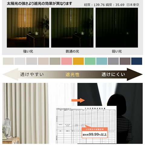 【完全遮光、遮熱、防音の無地カーテン】生地の裏にアクリル樹脂コーティング加工を施した、上質な生地で作った99.9%遮光カーテン