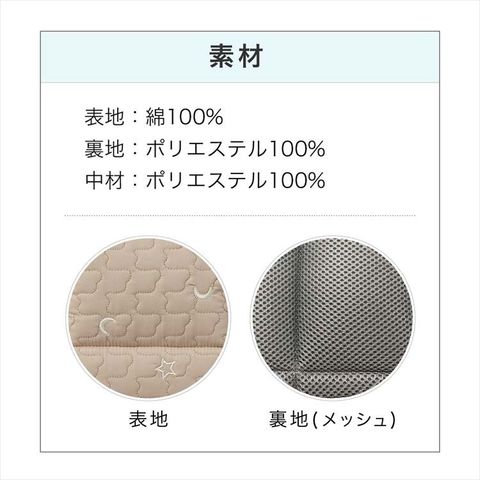 | 材質 | 表地:綿100% 裏地:ポリエステル100% 中材:ポリエステル100% |
