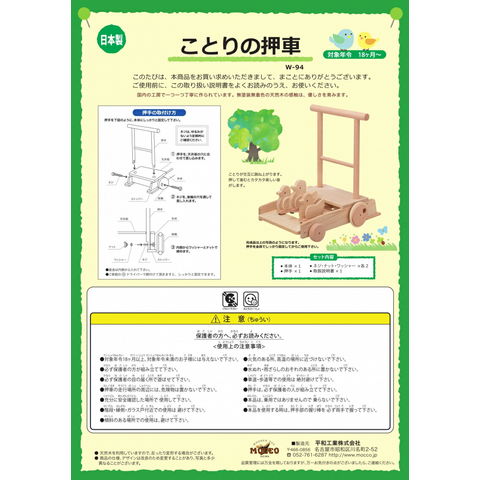 | 商品説明 | あんよの練習ができる日本製の手押し車です。 前進するとかわいいことりたちが交互に跳ね上がり、「カタカタ」と木製ならではの楽しい音が出ます。 タイヤ2箇所に衝撃吸収のゴムがついていて、スムーズに進みます。 無塗装無着色の天然木を使用し、防腐剤や防虫剤は一切使用されておらず、無塗装の白木なので木の温もりをたっぷりと感じ、丁寧に面取りが施されています。 見た目もシンプルなので、どんなお部屋にもマッチしてデザイン性の高く、化粧箱入りで出産祝いなどのギフトにも人気! あんよの練習用に、男の子にも女の子にもオススメ! |