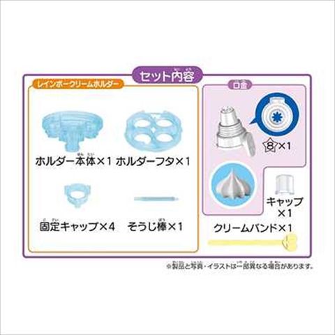 商品説明レインボークリームが絞れるレインボークリームホルダー、口金、クリームバンドのセットです。ホイップるシリーズのクリームをアタッチメントにセットすることで、一度に4色のクリームが絞れます。