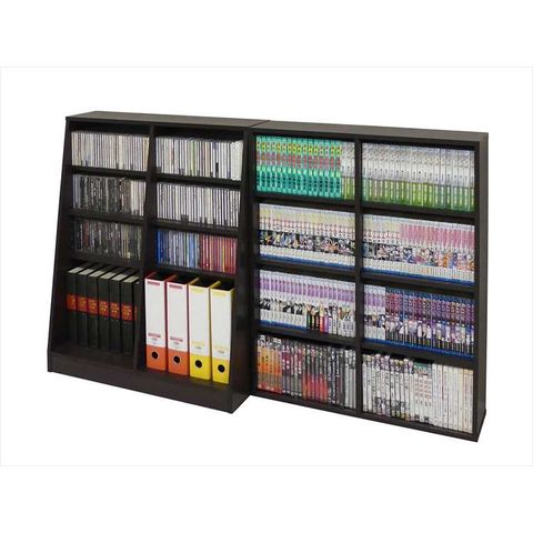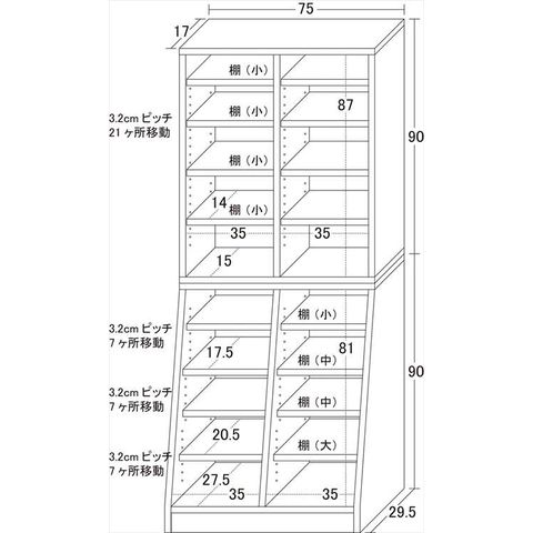 | 商品説明 | 梱包サイズを小さくするため、側板を分割しています。 奥行は本体部分約17cm、地板約22cmと薄型設計ですので、圧迫感がなく、CDやDVD、文庫本などをサイズに合わせて、たっぷり収納できます。 詳細:上段内寸約W56.5×D15.5×H86.5cm 下段内寸約W56.5×D15.5(20.5)×H86.5cm 可動棚6枚(上段下段ともに3.2cmピッチ21ヶ所移動可) |