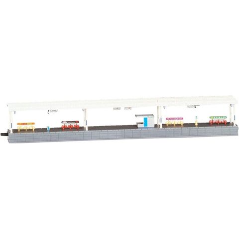 商品説明島式ホームセット(近代型)の延長用ホーム。高架用ホームに使用するための階段部、屋根中央部採光パーツが付属している。売店やベンチなども付属している。