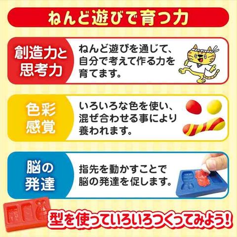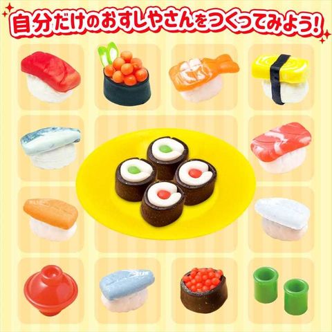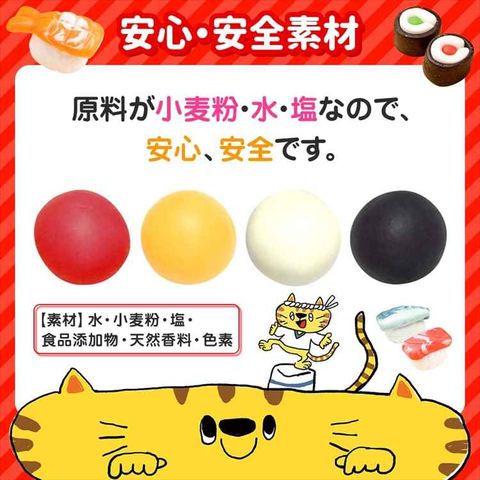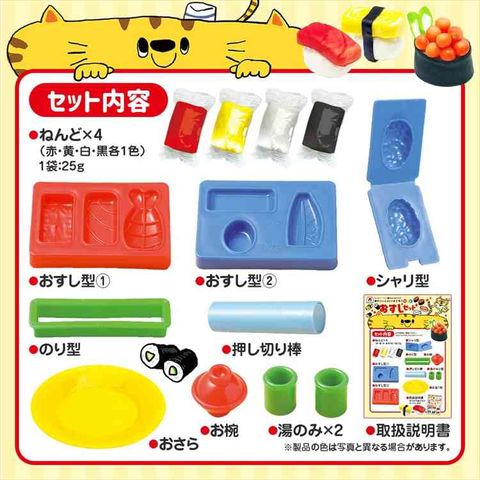 | セット内容 | ・ねんど各25g(赤、黒、黄、白) ・おすし型×2 ・シャリ型 ・のり型 ・押し切り棒 ・お皿 ・お椀 ・湯のみ×2 ・取扱説明書 |