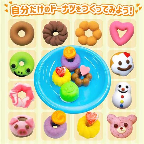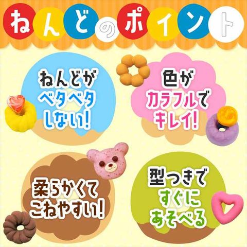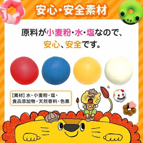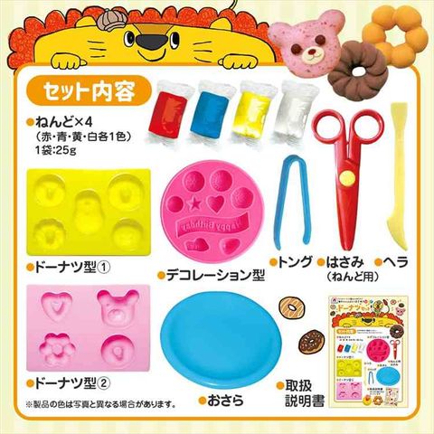 セット内容・ねんど各25g(赤、青、黄、白) ・ドーナツ型×2 ・デコレーション型 ・おさら ・トング ・はさみ(ねんど用) ・ヘラ ・取扱説明書