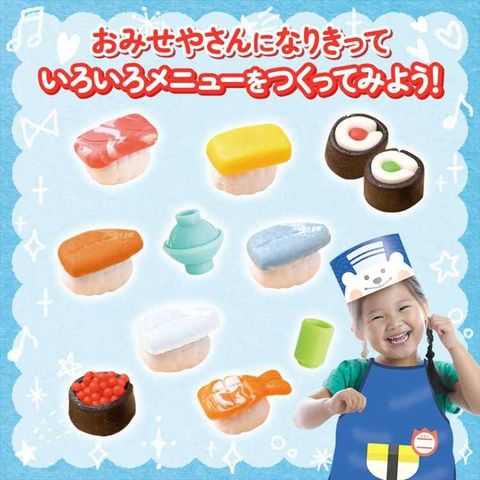 | セット内容 | ねんど×4(赤・黄・白・黒 各1色)1袋:35g なりきりエプロン なりきりぼうし(紙製) おすし型(1) おすし型(2) のり型 しゃり型 おさら おわん おしきり棒 ゆのみ×2 ヘラ ねんど用はさみ ふくろ(遊んだ後ねんどを保存します) メニュー / おさらシート / 紙小物(紙製組み立て品) 取扱説明書 |