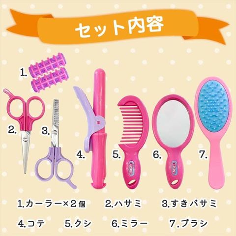 | セット内容 | ・ミラー×1 ・ブラシ×1 ・クシ×1 ・コテ×1 ・カーラー×2 ・ハサミ×2 |