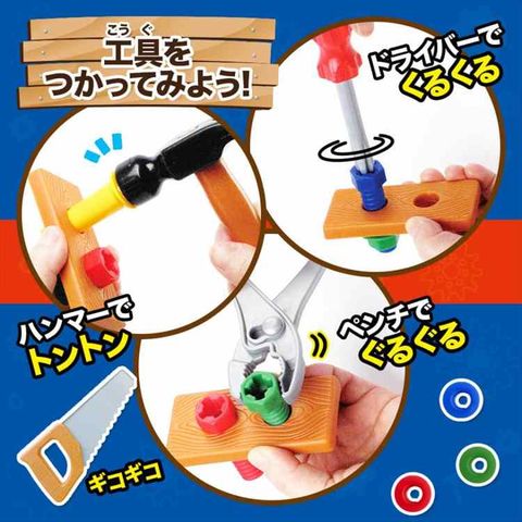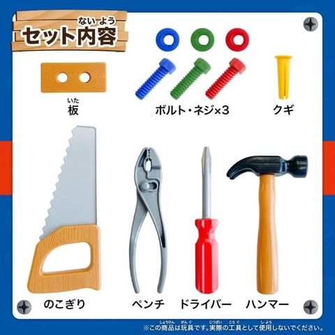 | セット内容 | ・ハンマー×1 ・ドライバー×1 ・のこぎり×1 ・ペンチ×1 ・ボルト×3 ・ネジ×3 ・くぎ×1 ・板×1 |