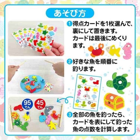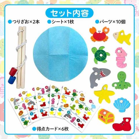 | セット内容 | 【セット内容】 つりざお×2本 シート×1枚 さかなパーツ×10個 点数カード×6枚 |