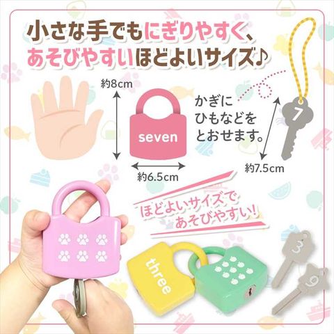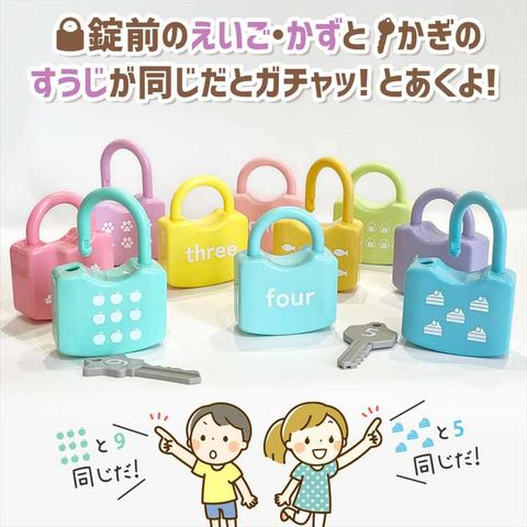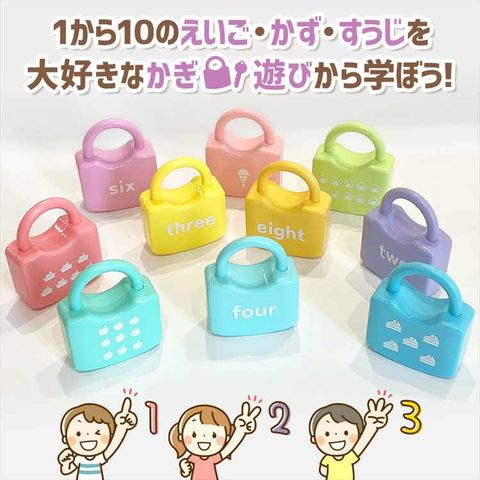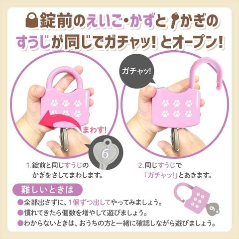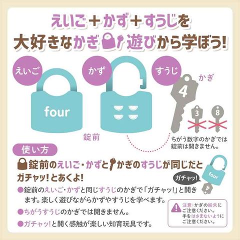 | 商品説明 | えいご+かず+すうじを大好きなかぎ遊びから学ぼう! 錠前のえいご・かずと、かぎのすうじが同じだとガチャッ!とあくよ! 【あそびかた】 錠前のえいご・かずとおなじすうじのかぎで「ガチャッ! 」と開きます。 楽しく遊びながらかずやすうじを学べます。 ちがうすうじのかぎでは開きません。 ガチャッ!と開く感触が楽しい知育玩具です。 【難しいときは】 全部出さずに、1個ずつ出してやってみましょう。 慣れてきたら個数を増やして遊びましょう。 わからないときはおうちの方と一緒にえいごとかず、すうじを確認しながら遊びましょう。 【製品材質】 錠前:ABS かぎ:ABS ※注意 かぎの紛失にご注意ください。 手をはさまないようにご注意ください。 |