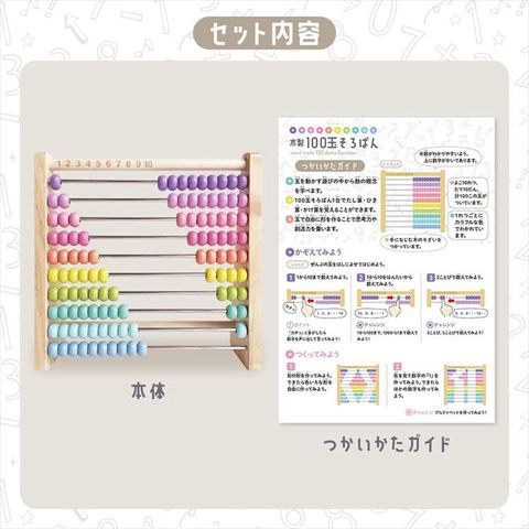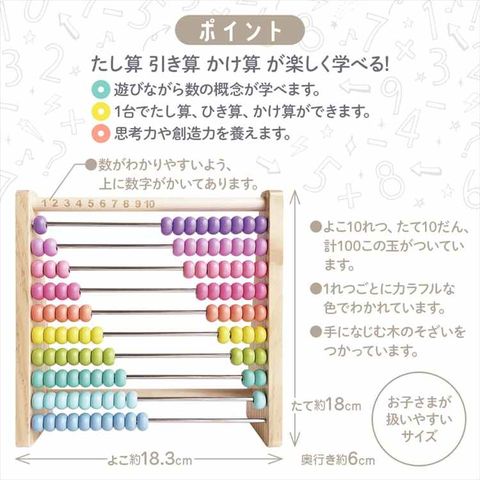 商品説明玉を動かす遊びの中から数の概念を学ぶ100だまそろばん。 1台でたし算、ひき算、かけ算を覚える事ができます。 玉で自由に形を作る事で思考力や創造力を養います。 たのしく数を覚えましょう。 【特徴】 1.数がわかりやすいように数字がついています。 2.横10列、縦10段、計100個の玉がついています。 3.1列ごとにカラフルな色でわかれています。 4.手になじむ、ぬくもりのある木の素材を使っています。