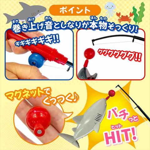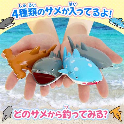 | 商品説明 | 釣って遊ぼう!サメまみれ! 釣竿の巻き上げ音と、しなりが本物そっくり! サメの鼻先にネジが付いていて、釣竿のマグネットでくっつく仕組みです。 リールの糸は長さが調節できて、最大約70cm程まで伸ばすことができます。 【遊び方】 お風呂や家庭用プールなど サメを水の中に浮かべて、釣り竿を使って釣ってみよう!! 遊び終えたら水からサメを取り出して水気をよく拭き取って保管してください。 水に浮かべてどんどん釣っちゃおう! 【サメの種類】 ジンベエザメ メガマウス シュモクザメ ホホジロザメ |