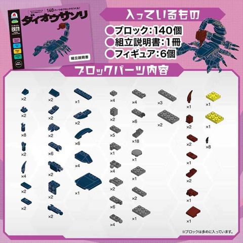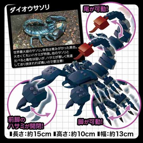 | 商品説明 | 脚や尾が可動!前脚のハサミが開閉!組立説明書つき!世界最大級のサソリ(ダイオウサソリ)を、ブロックでリアルに再現!いろんなところが動いて、つくってからも楽しめる!組立説明書がわかりやすいので、はじめてでも迷わずに作れます。 |