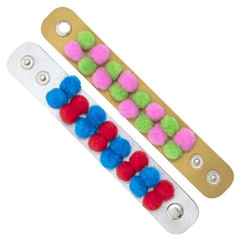 商品説明 ポンポンがついたオリジナルのブレスレットが作れるキットです。4色のポンポンをお好きな組み合わせで縫い付けて、2本のブレスレットが作れます。お子様のための初心者キットで、材料は全てキットに含まれているのですぐに始められます。針は安全なプラスチック製で、写真入りの説明書を見ながら簡単に作れます。