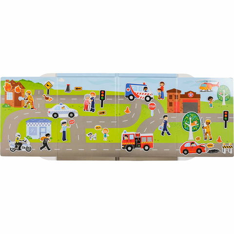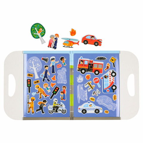 商品説明 男の子が大好きな乗り物や消防士さん、道路標識など、様々な街のパーツを貼って遊べるマグネットシートです。町の背景に、キャラクターを置いてストーリーを考えよう! マグネットなので繰り返し遊べ応用力を育み、お話を作ったり、ごっこ遊びをして想像力や感受性を高めてくれます。パーツを貼り付けられるページもあり、お片付けを促してくれます。折り畳んでコンパクトに収納でき、持ち手付きでバッグの様に運びできるので、旅行やお出かけにもピッタリ♪