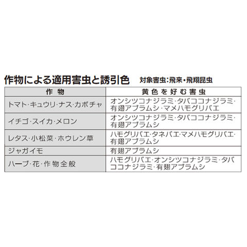 コナジラミ・アブラムシ・ハモグリバエなど、黄色を好む害虫を誘引し、粘着捕殺します。