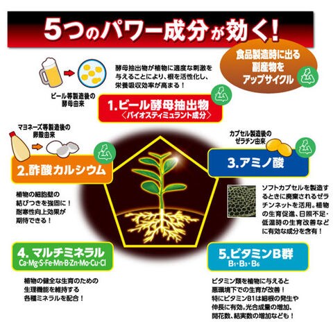 (バイオスティミュラント成分(ビール酵母抽出物)、酢酸カルシウム、アミノ酸、マルチミネラル、ビタミンB群)