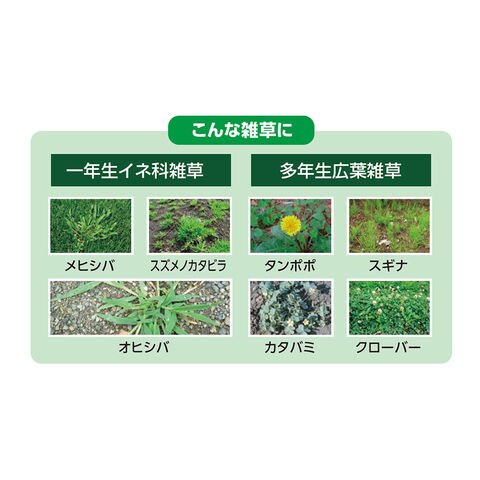 ・除草効果は最速7日~14日であらわれはじめ、長期間(約6ヵ月)※雑草の発生を抑えます。 ・3種類の有効成分で、一年生のイネ科雑草や多年生広葉雑草の発生を予防し、しつこいスギナなど各種雑草の葉や茎だけでなく根までスッキリ枯らします。 ・日本芝・ツツジ類のみの適用です。西洋芝にはお使いいただけません。 |