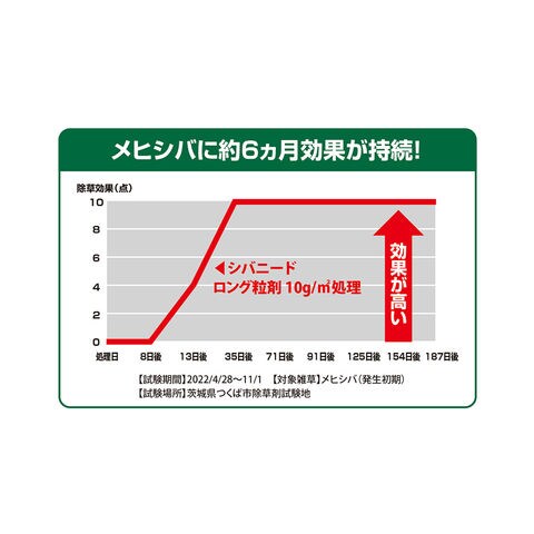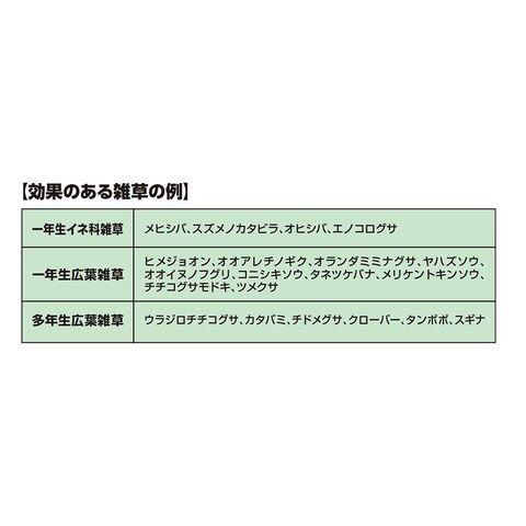 | 約6カ月 ※最大散布量を散布した場合の刈り取り不要期間の目安で、雑草がまったく発生しないということではありません。持続期間は土壌条件、気象条件によって変動します。 |