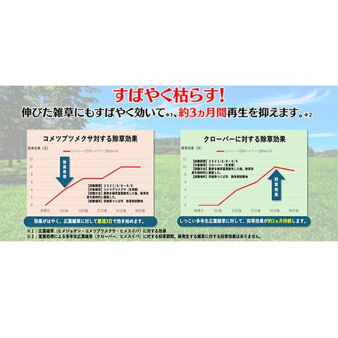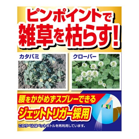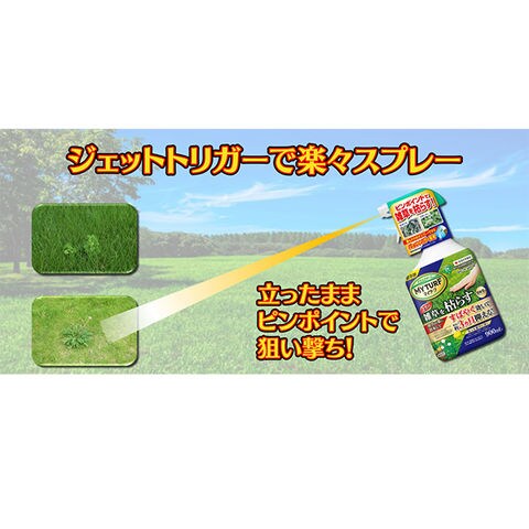 ・除草効果は最速3日からで現れはじめ、最長約3ヵ月間雑草の発生を抑えます。 ・伸びてしまった雑草にも素早い効き目。一年草のイネ科雑草や広葉雑草、しつこいカタバミも枯らします。 ・ピンポイントで狙えるジェットトリガースプレー。雑草が濡れる程度にまくだけで効果が表れます(50~200ml/m2)。 ・日本芝専用です。西洋芝にはお使いいただけません。 |