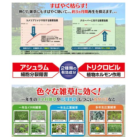 ・除草効果は最速3日からで現れはじめ、最長約3ヵ月間雑草の発生を抑えます。 ・伸びてしまった雑草にも素早い効き目。一年草のイネ科雑草や広葉雑草、しつこいカタバミも枯らします。 ・容器からそのまま撒ける手軽さが魅力。雑草が濡れる程度にまくだけで効果が表れます(50~200ml(/m2)。 ・日本芝専用です。西洋芝にはお使いいただけません。 |