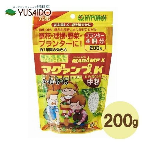 ハイポネックス マグァンプK 200g 中粒遅効性 緩効性 化成肥料 花壇 寄せ植え 観葉 植物 庭木 果樹 野菜 くだもの ペチュニア ビオラ パンジー トレニア インパチェンス ゼラニウム ベゴニア モンステラ ゴムの木等に効く!