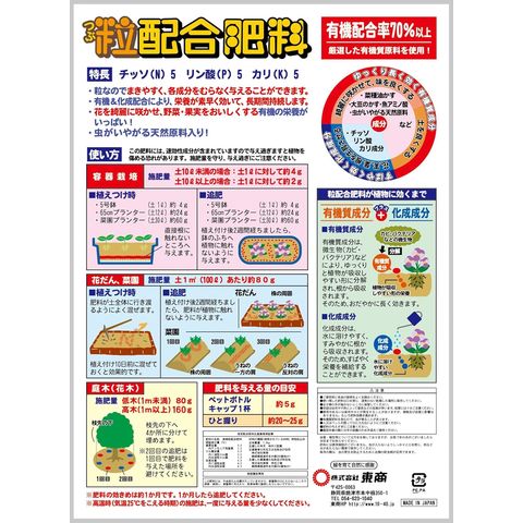 形状が粒なので撒きやすく、有機質原料と化学原料をバランス良く配合。