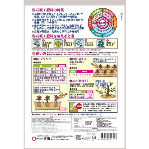 花芽がよく付く有機のリン酸・カリ肥料です。きれいな花を次々と咲かせたいときにおすすめです。