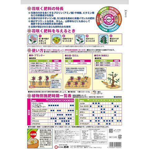 花芽がよく付く有機のリン酸・カリ肥料です。きれいな花を次々と咲かせたいときにおすすめです。