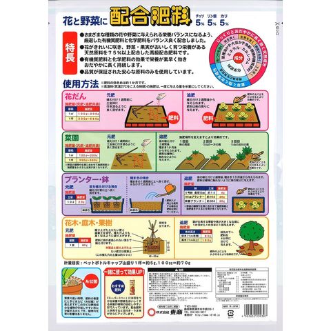 植物に必要なチッソ・リンサン・カリをバランス良く配合してありますので花・実・葉・根に安定して効く。