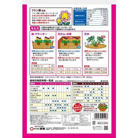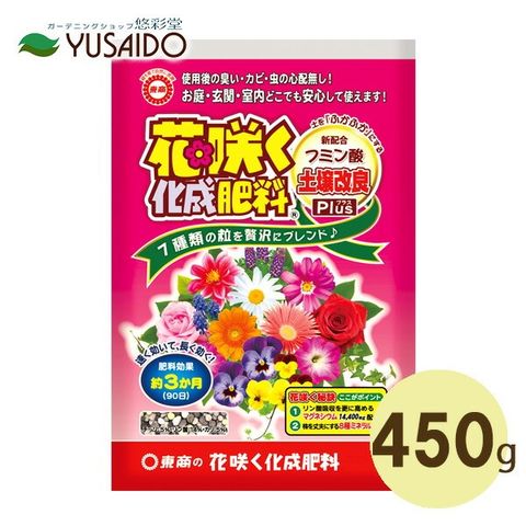 ●リン酸成分が高い配合設計。花が良く咲きます。●臭い・カビ・虫の心配がないクリーンな肥料です。室内・ベランダ・玄関先に最適です。●効き目90日!長く効きます。長く花を楽しむパンジー・ビオラなどに最適です。●すぐに溶けて早く効きます。すぐに栄養を与えたいときに最適です。