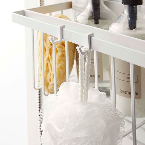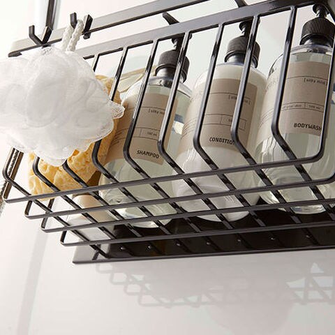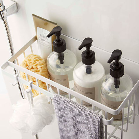 浴室の壁面に強力マグネットで取り付けることができる便利なマルチバスケット。ディスペンサーボトル・チューブをまとめて収納。 手前のバーにはタオルなどを横から掛けられます。