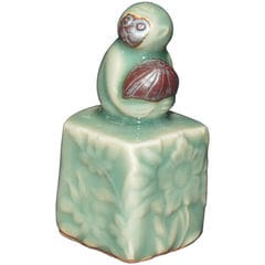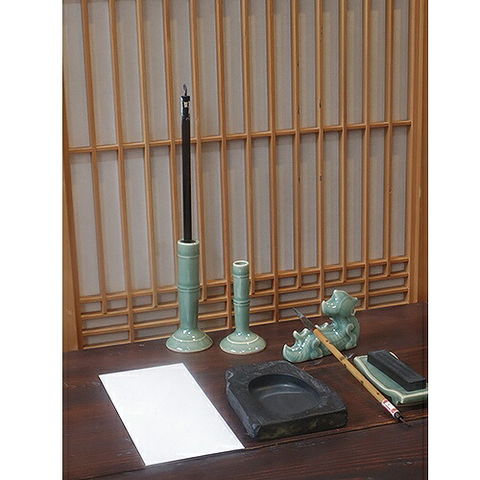 | 側面に、胴紐模様を施した珍しい青磁の筆立です。筆を下にして立てられるため、筆が乾かず頻繁に使用する場合に便利です。ペン立てとしてもお使いになれます。 |